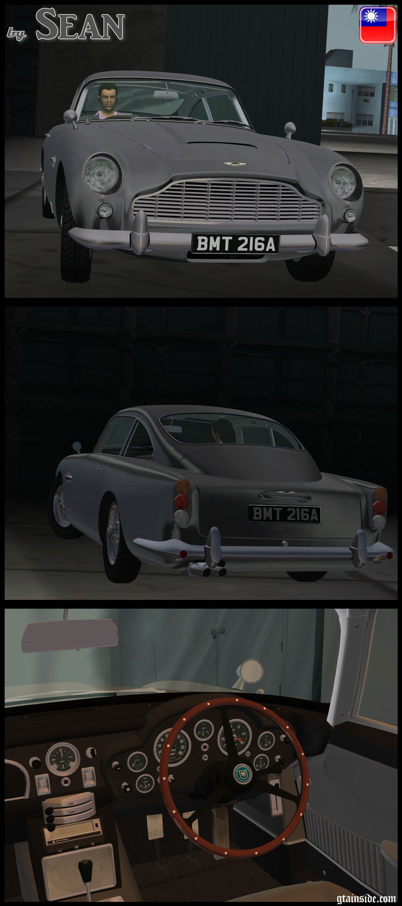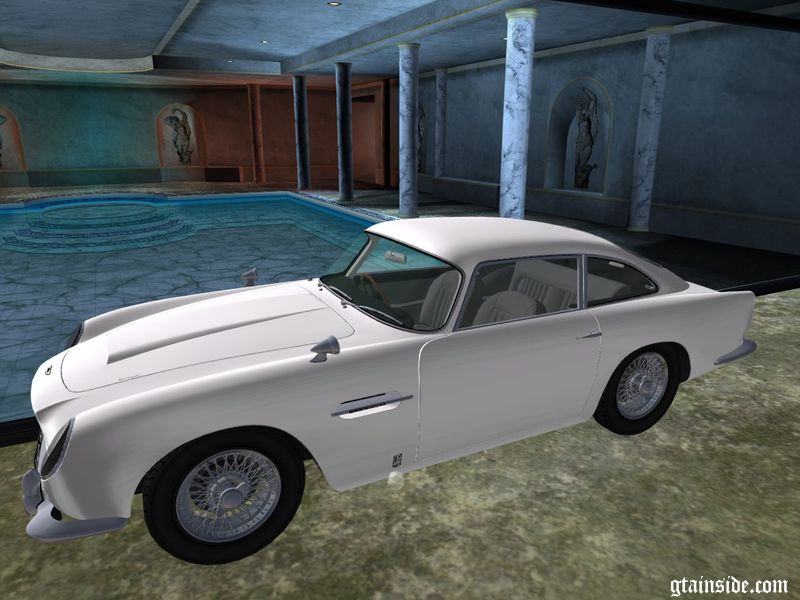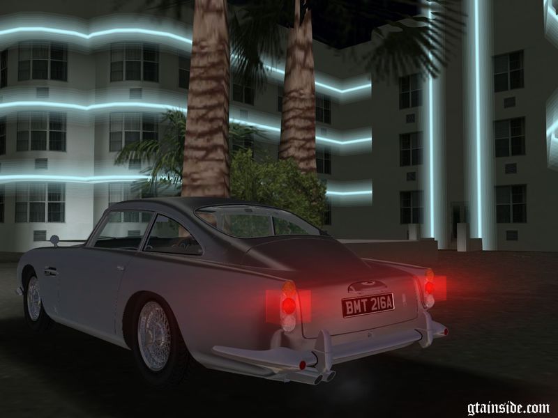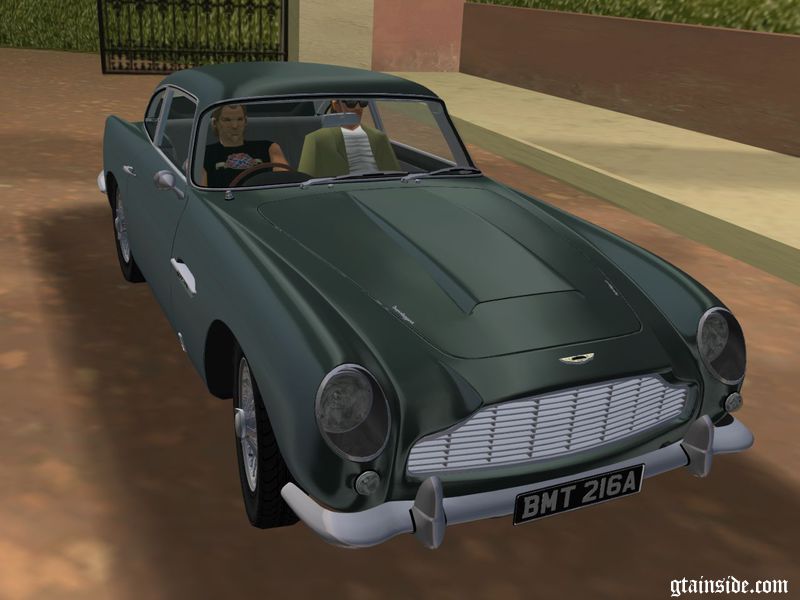 1965 Aston Martin DB5 Vantage для GTA VC с высокой детализацией модели и интерьера, повреждаемыми частями, номерным знаком 007, двумя версиями зеркал и индивидуальными настройками управления.