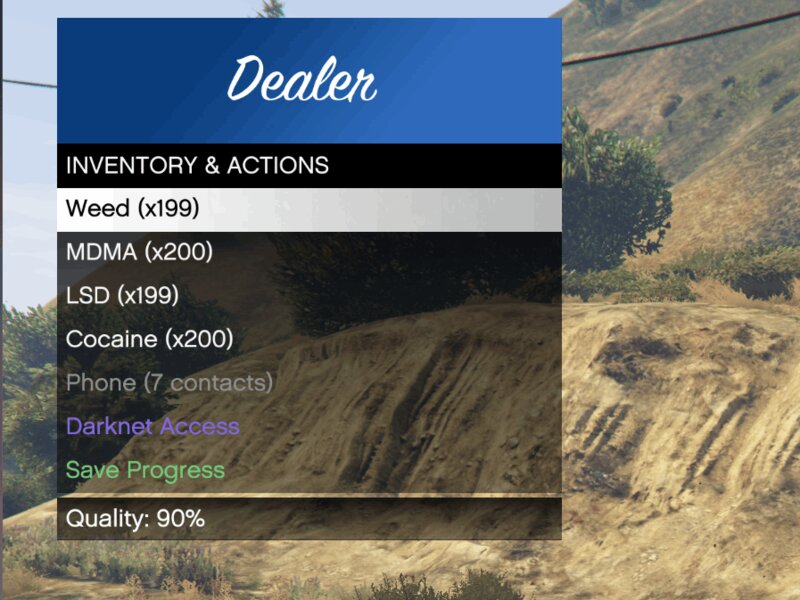 DealerGTAV: Drug Empire Simulator — уникальный мод для GTA 5, превращающий игру в прогрессирующий симулятор наркоторговли. Стройте криминальный бизнес от уличных сделок до масштабной сети распространения по Сан-Андреасу с динамическими зонами спроса, управлением курьерами, мобильной лабораторией в фургоне и системой поставок. Управляйте рисками, качеством товара и взаимодействуйте с полицией в реалистичной экономике наркобизнеса.