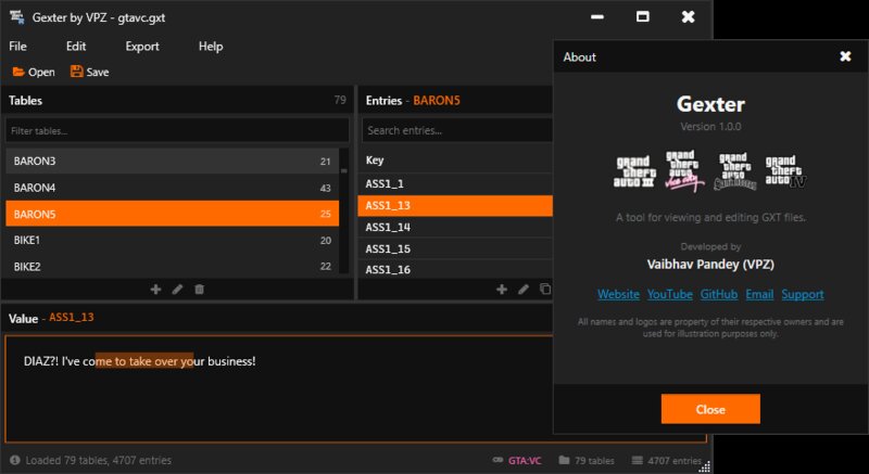 Gexter — это мощный инструмент Windows для просмотра, редактирования и экспорта текстовых файлов игр GXT из GTA III, Vice City, San Andreas и GTA IV, обладающий современным темным пользовательским интерфейсом, возможностью редактирования нескольких таблиц, расширенным поиском, сохранением кода форматирования и полными операциями CRUD.