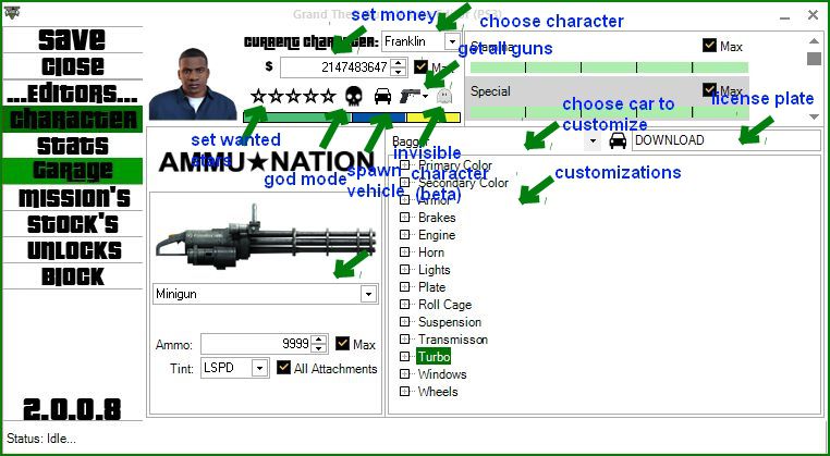 измените свои навыки, создайте КАЖДЫЕ транспортные средства по индивидуальному заказу, получите максимальное количество боеприпасов, пропустите миссии, измените запасы, получите все имущество бесплатно.