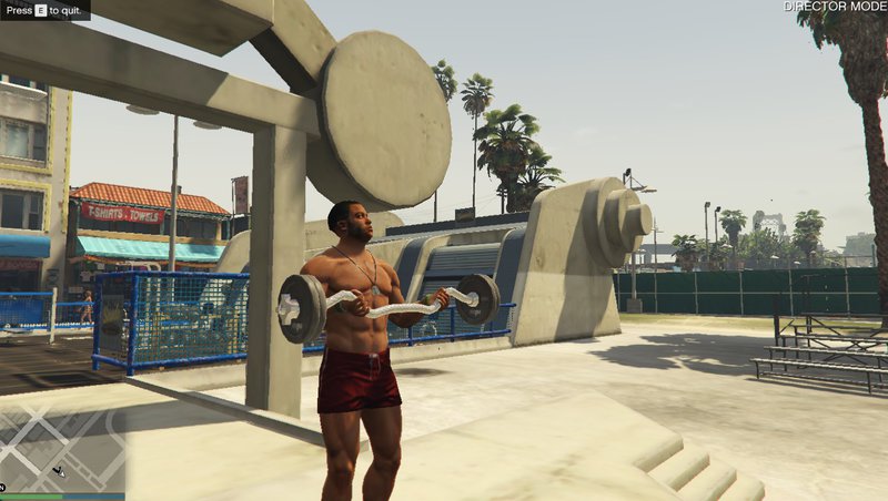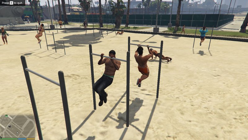 Отправляйтесь на площадку армрестлинга на пляже Веспуччи, пройдите рядом с силовой скамьей или перекладиной для подтягиваний и нажмите кнопку «B», чтобы сделать силовой жим или подтягивание.